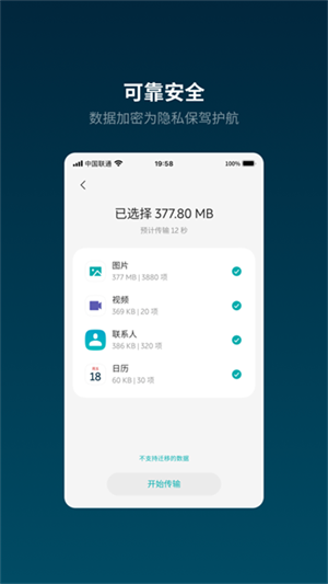 6、安全迁移:仅限两台手机直接连接传输,杜绝第三方获取数据,并全方位保护手机隐私安全。