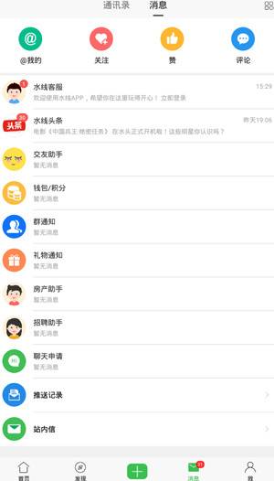 1、在来haolingcc下载安装水头在线app,运行软件,可以看到有首页、发现、消息、我四个板块;