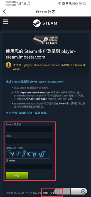 2、在steam社区界面中输入steam用户名、密码、字符后点击登录即可,若用户没有steam帐户可以点击下方创建一个新的帐户,创建完成后在重复上方操作进行登录即可完成绑定