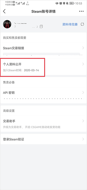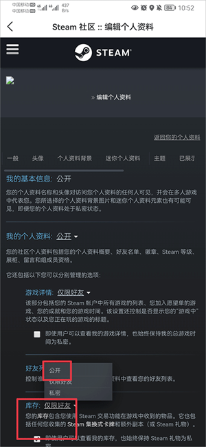 2、然后在steam账号详情界面中找到个人资料公开,并点击进入