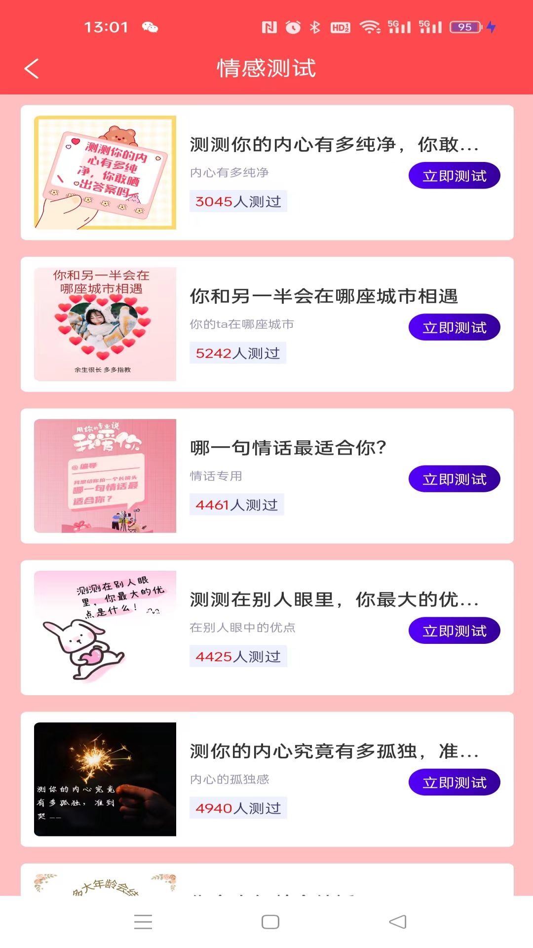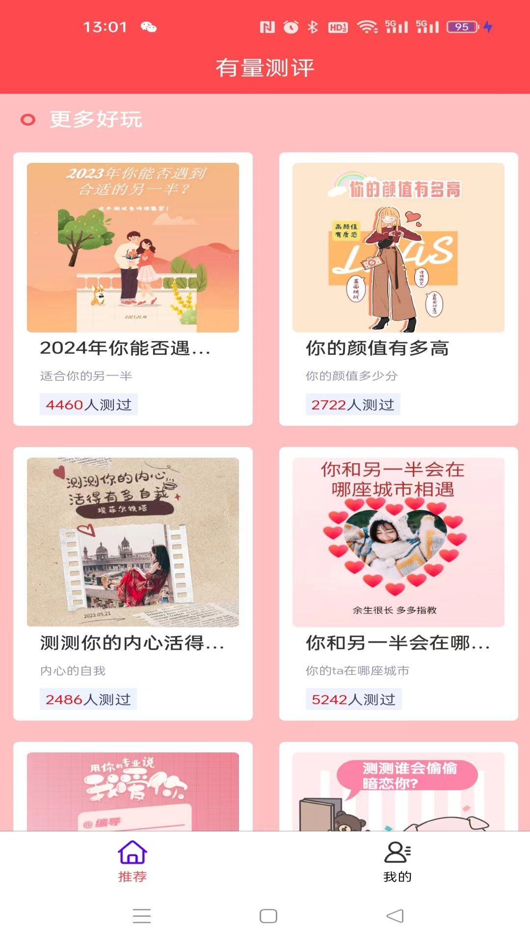 有量测评作为一款全新上线的免费心理测试软件。提供的题目丰富,充分满足人们的测试需求。随时都能轻松操作,在测试后更了解自己的内心。里面囊括不同类型的测试,可以满足每个人的需求。可以更好地了解自己之外,也能够轻松打发时间。测试的结果仅供娱乐性,快来试试吧!