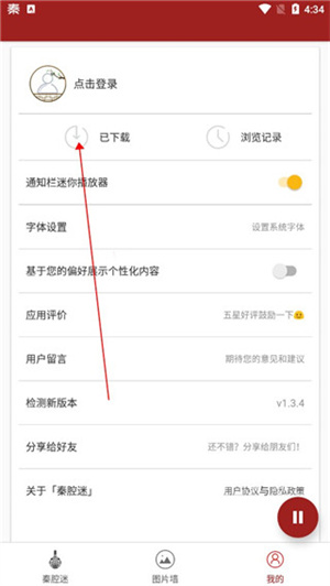 1、下载好秦腔迷app后,点击进入,在首页中选择【唱段】点击进入。