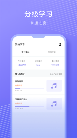 2、练耳有声、旋律辨识、乐理知识及旋法等功能一应俱全,进度清晰可见。