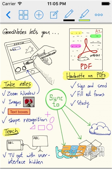 免费安装goodnotes 可以通过 iCloud Drive / iTunes / Dropbox 和 Open in 来导入文件,可导入的文件类型除了 PDF 外,还可以导入 Office / iWork 文件。 它比其它 PDF 阅读器的优势在于它本质上是一个手写笔记应用,所以你在 PDF 上书写时能发挥上述的所有功能,这使得它的书写体验远好于其他 PDF 阅读器。其次还有一个我没发现哪个 App 也能做到的功能是复制一个文件的页面到另一个文件。当然常规的高亮文字、加页和调整页面顺序它也都能做到。有了这些工具,你就可以自由地制作 PDF 。