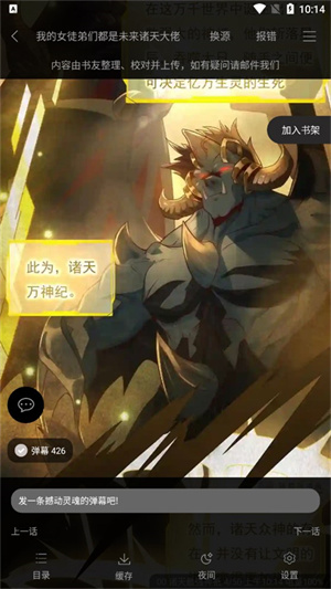 3、打开你喜欢看的书籍,app支持章节目录选择、夜间模式、自定义调整亮度等功能。