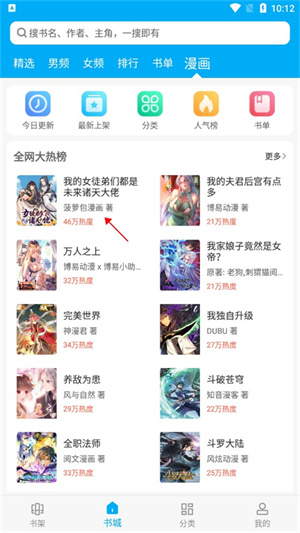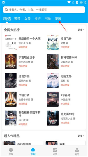 1、在书城界面找到漫画栏点击。