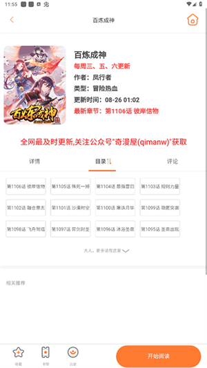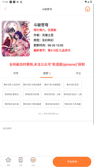 在漫画详情页,进行收藏、添加到书架或查看历史记录,然后点击开始阅读。