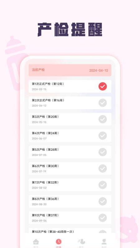 2)定时提醒产检时间,快速了解预约医院、医生等相关信息,提高孕期产检效率。