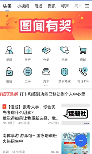 2、点击首页我们可以看到招聘、房产、相亲、商城等功能,并且还可以看小视频、附近、咨询等。