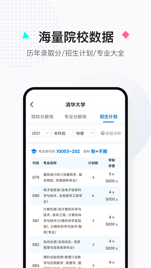 覆盖全国3000多所高校,同步更新官方考试院院校、专业录取数据、招生计划;查分数、查专业、查院校一站式服务,院校对比、大学排名、重点学科、优势学科评估一看便知;