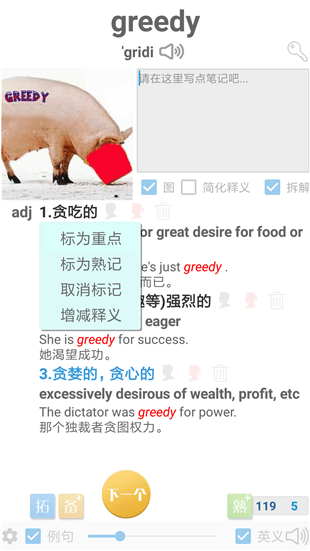 实用功能,自动标蓝重点释义和标记熟记释义,帮助用户集中精力记忆重要的词汇,增加记忆效果。