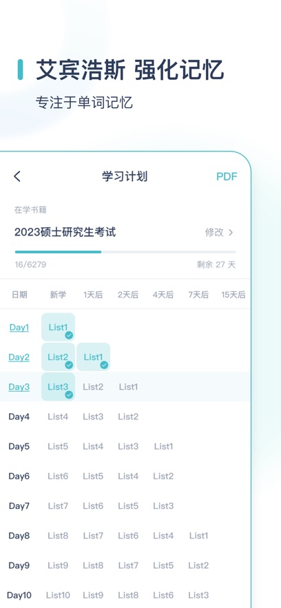 依托于著名的艾宾浩斯记忆算法,您可以利用其强大的清单管理引擎,高效率地安排并加强对单词词汇的记忆强化。