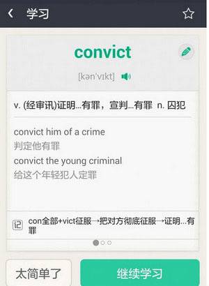 4、轻触屏幕,会弹出相关解释和短语。可根据自己的熟悉情况选择太简单了和继续学习。每天完成任务后可以打卡,打卡可以获得知米豆。知米豆可以购买其他的教材和参加一些知米的相关活动。