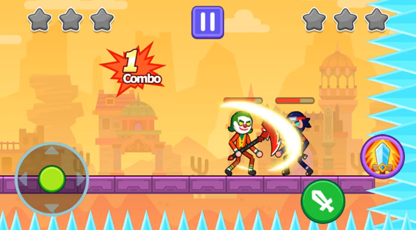游戏操作简单,左手控制方向,右手可以进攻。舞台上有许多强大的角色,小丑,忍者,海盗,神奇武器任意选择,激光剑,镰刀,神弓。