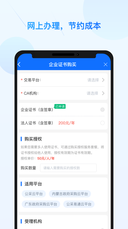 公采易通是一个移动数字证书平台,为企业用户、自然人用户提供证书申请、印章申请等功能;同时在电子卖场、电子招投标等交易场景中,实现数字证书的应用,包括扫码登录、扫码签章、扫码加密、扫码解密等。