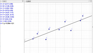 首先,输入数据点的坐标,之后在工具栏选定“最佳拟合直线”选项,在绘图区中框选数据点,即可得到最佳拟合直线,并且在代数区会显示最佳拟合直线的函数表达式。