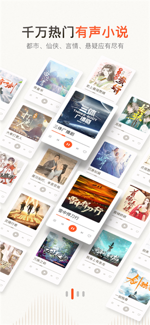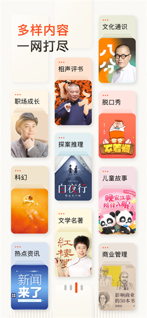 1、有声小说:恐怖悬疑、青春校园、穿越架空、浪漫言情、古风宫斗、玄幻传奇、经典短篇、文学名着,网罗韩寒、张嘉佳、蔡骏、桐华等知名作家,爱书之人必备神器。
