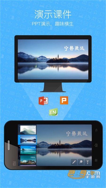 2.课件演示,支持PPT、WPS、Easinote的播放和翻页操作,以及PPT缩略图预览,一键黑屏等 3.文件传输,将移动端文件上传到PC(及智能平板)