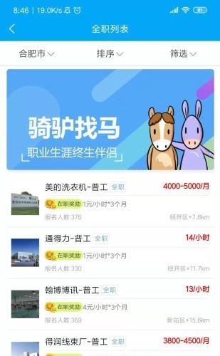 找工作骑驴找马是一款提供海量职位工作的手机软件,用户可以快速投放简历并接受面试邀请,无论身处何地都可以寻找到合适的工作,且完全免费。它是一家专注于蓝领社交移动招聘的品牌,致力于为普工客服等岗位提供专业的招聘服务。
