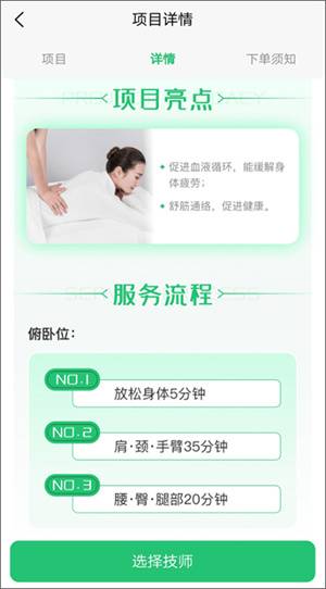 2、点击进入服务项目,可以查看到服务详情介绍、服务流程、注意事项等信息。确认无误后,点击选择技师