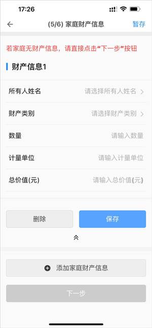 填写家庭成员情况,如果有家庭成员按要求添加填写家庭成员信息,可添加多名保存,如是单身可直接点击下一步。