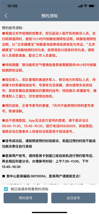 3、查看预约须知,然后根据自己的需求选择“预约挂号”还是“当日挂号”