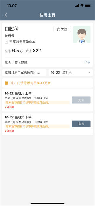 6、选择自己要挂号的那个专家,里面会显示他的挂号情况,看看有号还是没号,有号的就选择时间段后支付即可