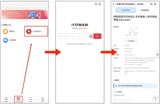 在 KingDraw 移动端的主界面,点击【工作站】就可以找到【化合物百科】。进入化合物百科界面后,在搜索栏中输入化合物的名称、分子式等信息,就可以搜索相关化合物信息。