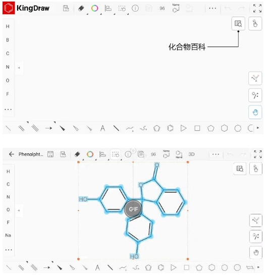 当我们在画板中绘制完成化合物的结构式后,只需要使用【框选工具】选中结构式,然后点击右上角的【化合物百科】按钮,就可以搜索相关化合物信息。