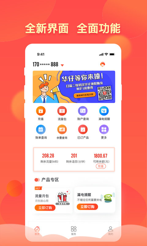 一站式支持实时话费、历史账单、3/4G流量、积分余额、套餐余量、已订业务、个人信息等查询,随时随地准确清晰!
