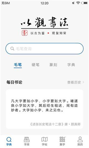 以观书法APP是一款专注于书法学习、欣赏和练习的移动应用软件,该软件整合了丰富的书法资源,提供了多种书法字体的高清字帖、拓本以及名家真迹,覆盖了行书、草书、隶书、篆书和楷书等不同书法风格,用户不仅可以查阅各个汉字的多种写法及其在名家作品中的实际展现,还能通过放大、局部观察等功能细致地模仿和临摹书法作品。