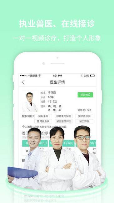 2)兽医在线视频诊疗功能,通过视频方式与兽医进行实时诊疗,解决养殖过程中遇到的问题。