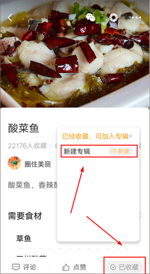3、用户可将食谱加入收藏内,用户可自定义创建专辑,来分类自己收藏的食谱,以便后续制作时查看!
