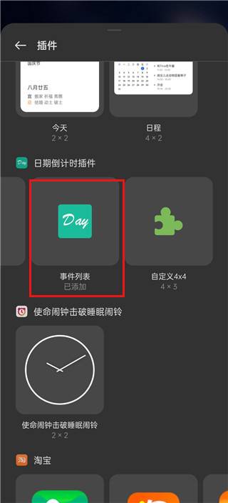 4、再回到手机桌面长按,选中日期事件插件,如图