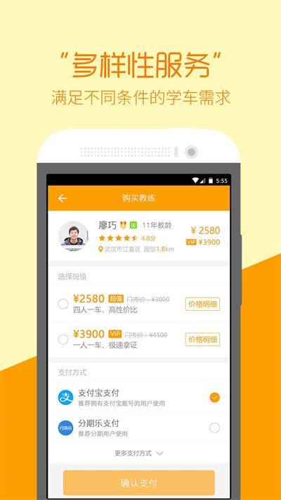 2、分期宝支付功能,使用分期宝轻松支付学车费用,减轻经济负担。