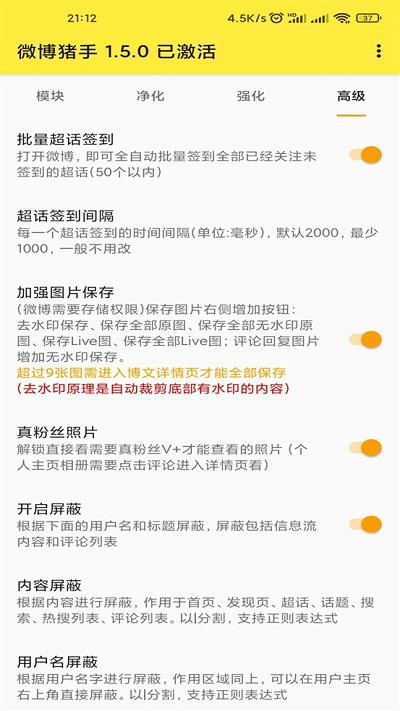 微博猪手模块内置版是一个非常实用的微博助理,可以帮助您优化微博客户。他们删除了屏幕上的广告、信息流建议和一些烦人的电话超级推荐,使用起来很容易。
