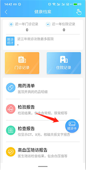 2、进入健康档案页面,点击右下角的“就诊卡”选项。