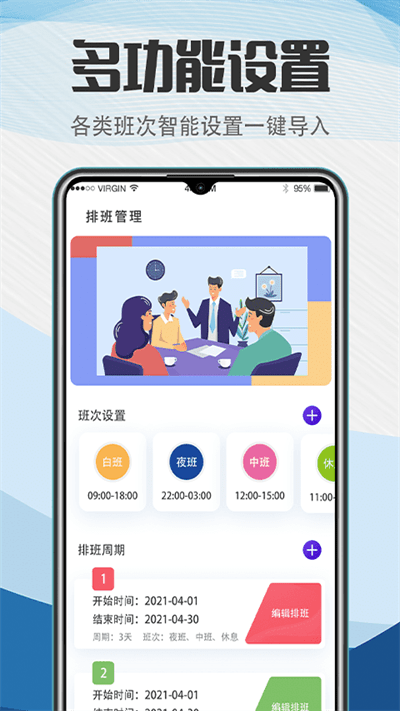·通过自定义班次,设置周期轮班快速生成排班日历表,让倒班轮班换班一目了然