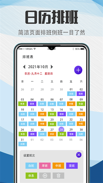 工作排班助手是智能提醒排班表软件,可以在这里进行智能化的排班服务,帮助用户快速处理各种排班事务,可以很好的满足你的上班要求,实用性比较的强。