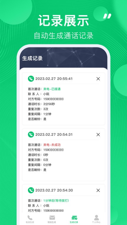 通话记录生成器app带HD通过简单的通话生成内容带来了更加全面的模式设定,简单的享受到自由设定的全方面号码服务,解决刚需的记录截图需求。
