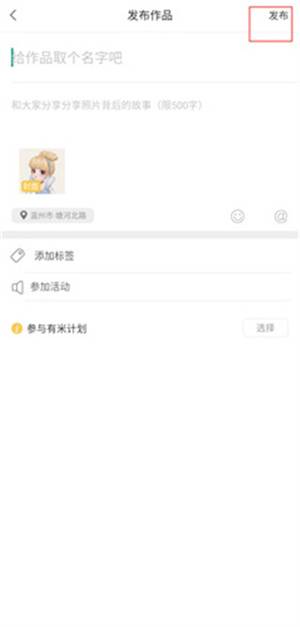 4、在发布作品页面中写上标题、文案,就可以点击右上角的发布按钮了。