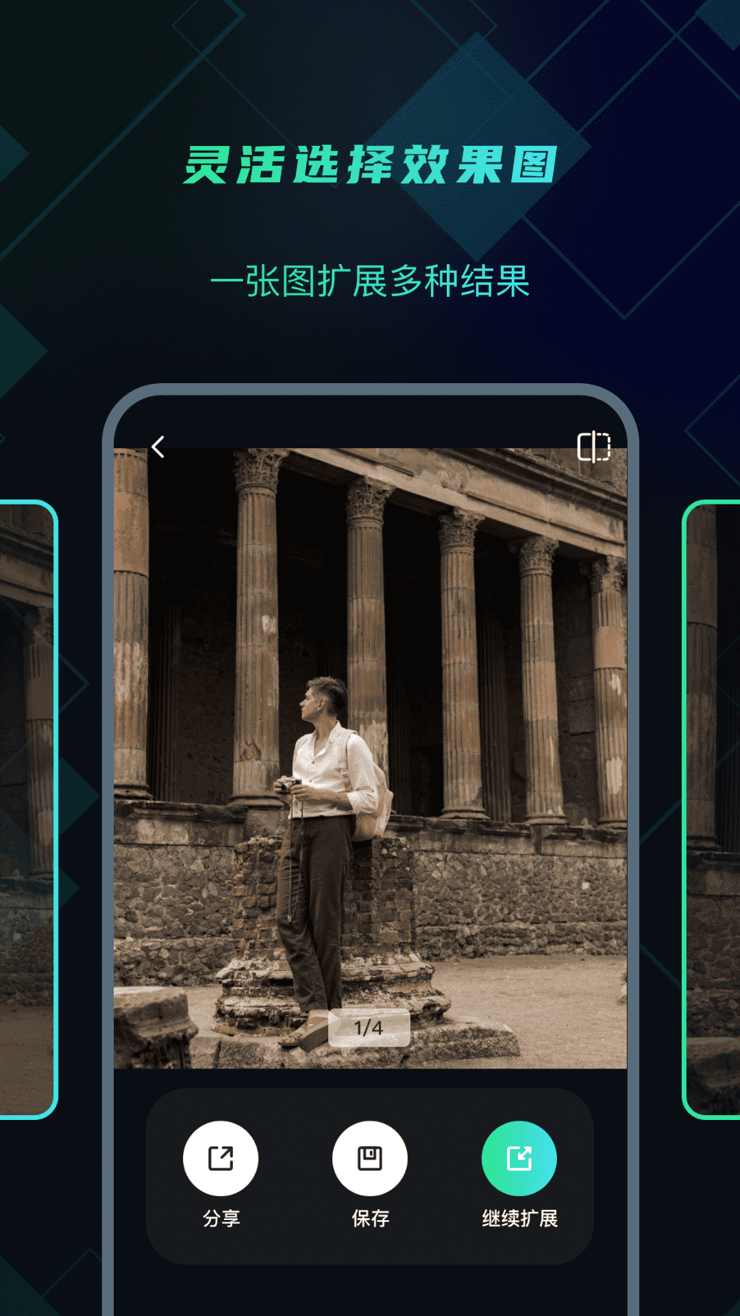 一键AI智能扩图操作简单直观,无需复杂的设置和专业的技能,您可以随意调整主体的大小以及对融合后的图片进行进一步的编辑和调整,融合后的图片可以保存到相册中,方便您随时查看和分享。