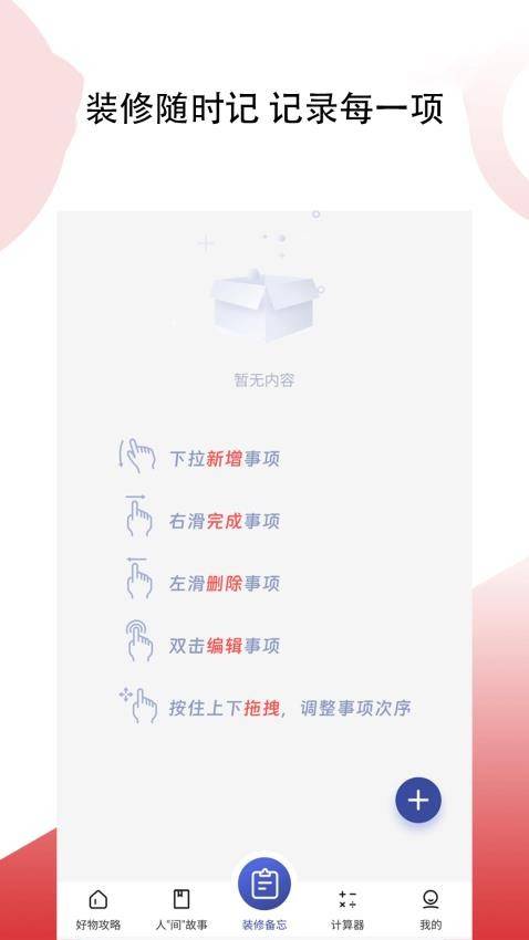 3)用户可以使用装修备忘功能,记录和管理装修中的各项事务,可以随时查看和修改,避免遗漏和混乱。