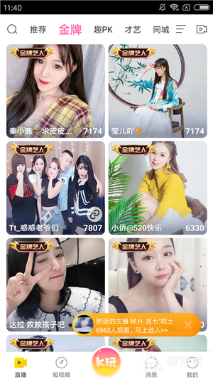 2、在推荐页面的旁边,大家可以选择金牌这个栏目,推荐的主播全是挂有金牌主播称号的,用户主要在主播当中找到自己感兴趣的进入到直播间。