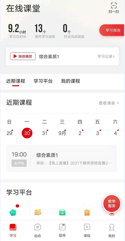 近期课程安排:显示本周直播安排(小红点标记表示有课程安排),单击“直播课表”可查看课表;