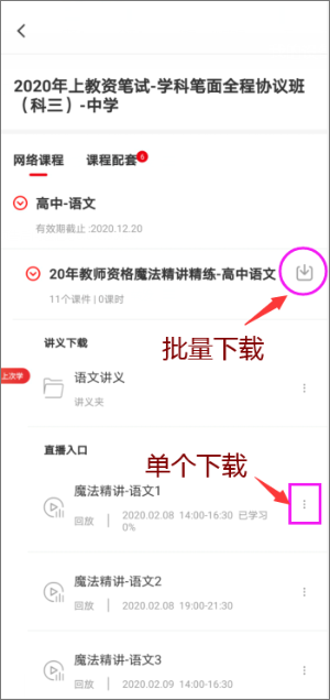 讲义下载:展开课程目录,可找对讲义文件夹下载对应电子讲义;通过【课程配套】电子讲义,可以批量下载配套讲义。