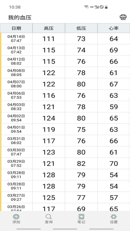 血压笔记,让您更加直观更加透彻了解自己的血压,对及时发现血压变化及调整高血压治疗方案起到了一定的参考依据.记录下每一天的身体感受,祝您健康!
