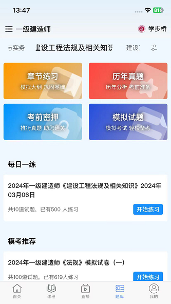 5.对于课程,您可以选择在线观看视频课程、参与直播课程、进行章节练习、模拟考试等