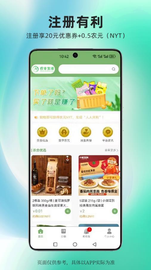 农合生活是一款已农产品为主要上架商品的手机商城,绝对超高质量市场流通,还有极具安全的生鲜产品种类,绿色无污染产品在线购物,超优质购物体验等你来!