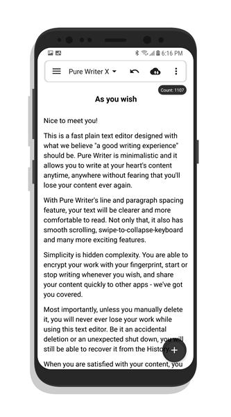 纯纯写作pro免登录是一款功能全面的写作软件,这里对用户的书写没有字数限制,支持历史记录的自动保存更大的好处是写作可以带来安心,和其他编辑器项目进行比较的时候纯粹的写作使用速度流畅。